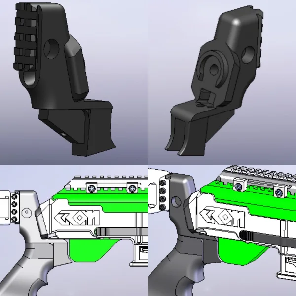 The CROM pistol grip adapter “PG” Adapter gives the owner the ability to put a rear picatinny mounted stock/brace and an AR style pistol grip. This adapter is compatible with any AR style grip. The rear picatinny accepts anything designed to fit Sig MCX style stocks or SB Tactical Braces. The adapter was designed to match up to the CROM PCC Chassis with perfect cosmetics. As you can see, it works on a standard Mossberg 500/590 receiver as well. For the shooter looking to put a pistol grip on his PCC, or a Shockwave, this is absolutely the best option on the market.